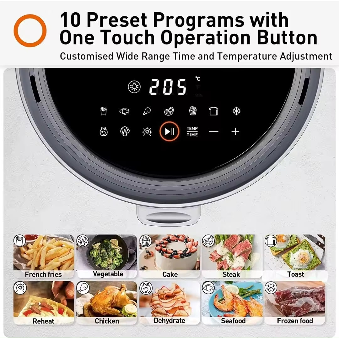 - Panel de control intuitivo de un solo botón: pantalla táctil digital LED con 10 programas preestablecidos que facilitan la cocción: patatas fritas, mariscos, pollo, bistec, pasteles, tostadas, descongelación, deshidratación, verduras, calentamiento. El panel de control fácil de usar y legible permite un calentamiento súper rápido.