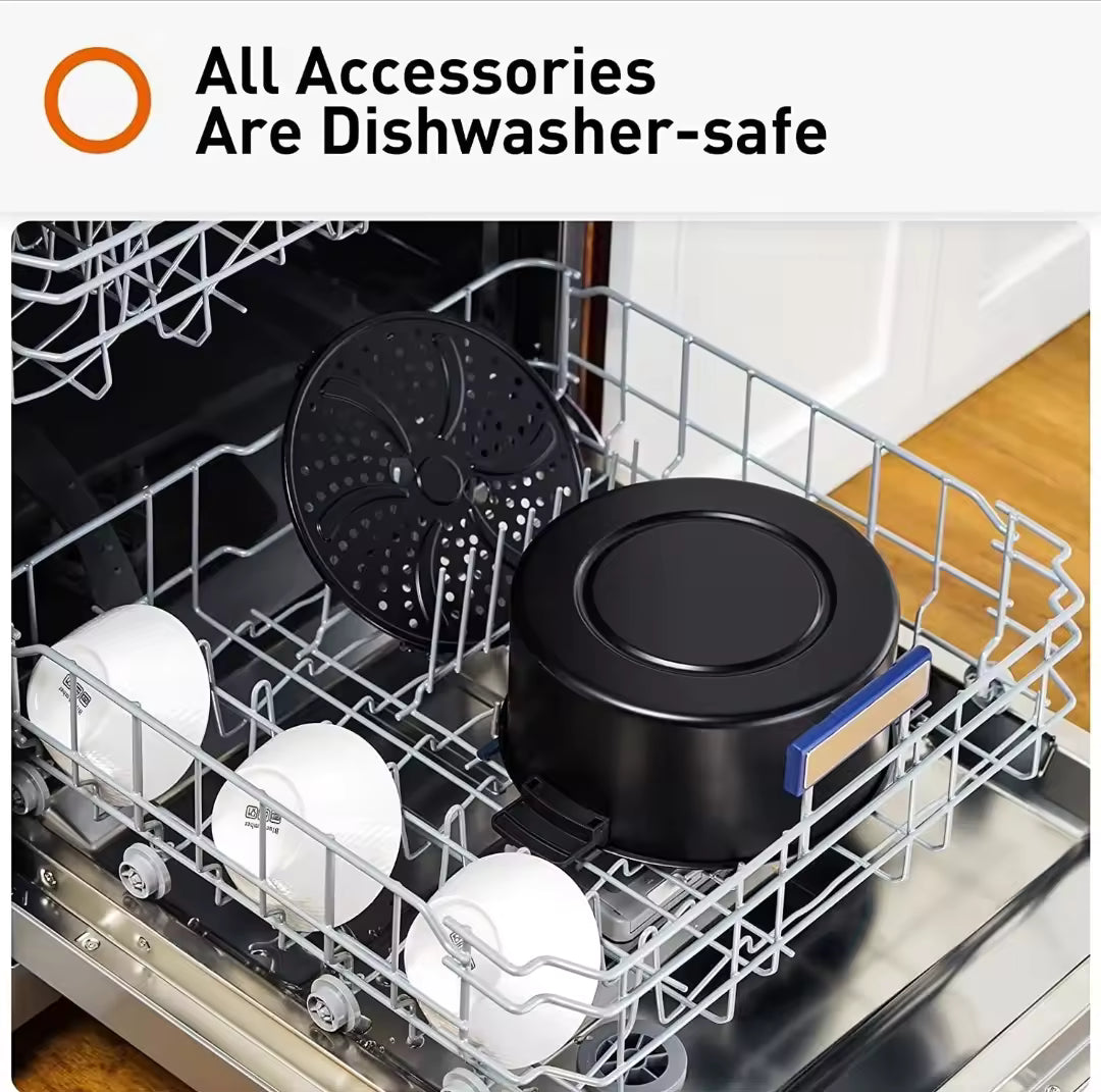 - Gran capacidad y fácil de limpiar: la cesta antiadherente de 5,5 L puede contener hasta pizza de 9 pulgadas, 250 g de papas fritas, 2-3 libras de pollo. El revestimiento libre de BPA garantiza una limpieza más fácil y es apto para lavavajillas. La red de protección del tubo de calefacción y el anillo de vidrio templado circundante permiten limpiar las manchas de aceite con un paño.