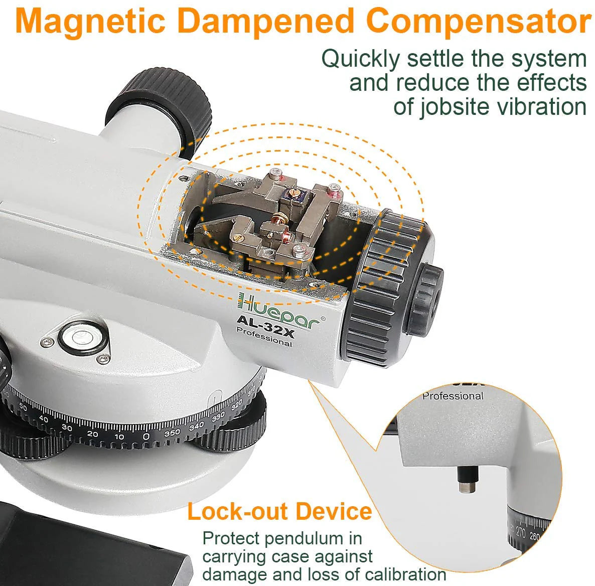 - COMPENSADOR AUTONIVELANTE CON BLOQUEO: El nivel óptico automático Huepar cuenta con un compensador magnético amortiguado autonivelante con bloqueo de transporte. El dispositivo de bloqueo protege el compensador durante el transporte y prolonga su vida útil. Además, los usuarios pueden examinar si el resorte de suspensión del compensador está dañado por la vibración después del transporte o no y comprobar el estado de funcionamiento del compensador.