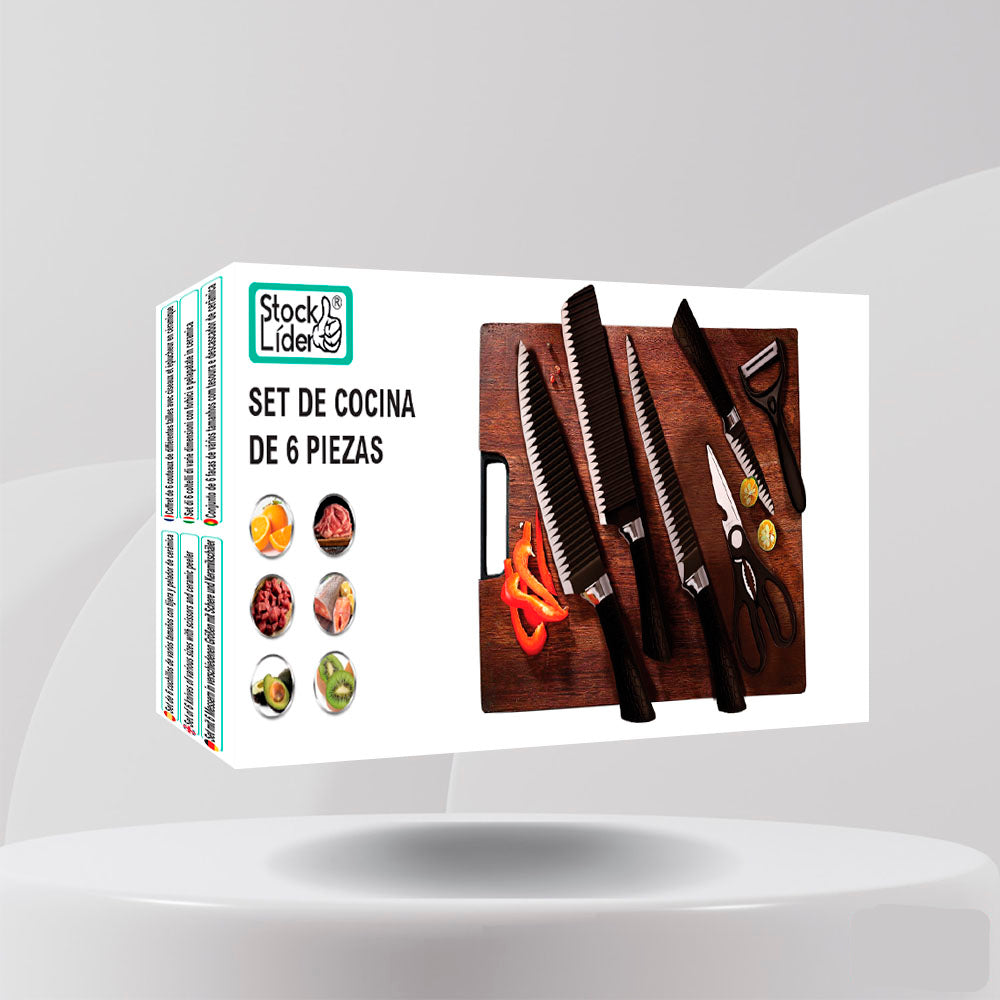 Este set incluye un cuchillo de chef, un cuchillo de trinchar, un cuchillo pequeño, un cuchillo mondador, un pelador de cerámica y unas tijeras, proporcionando todas las herramientas necesarias para enfrentar cualquier tarea en la cocina con facilidad y precisión.