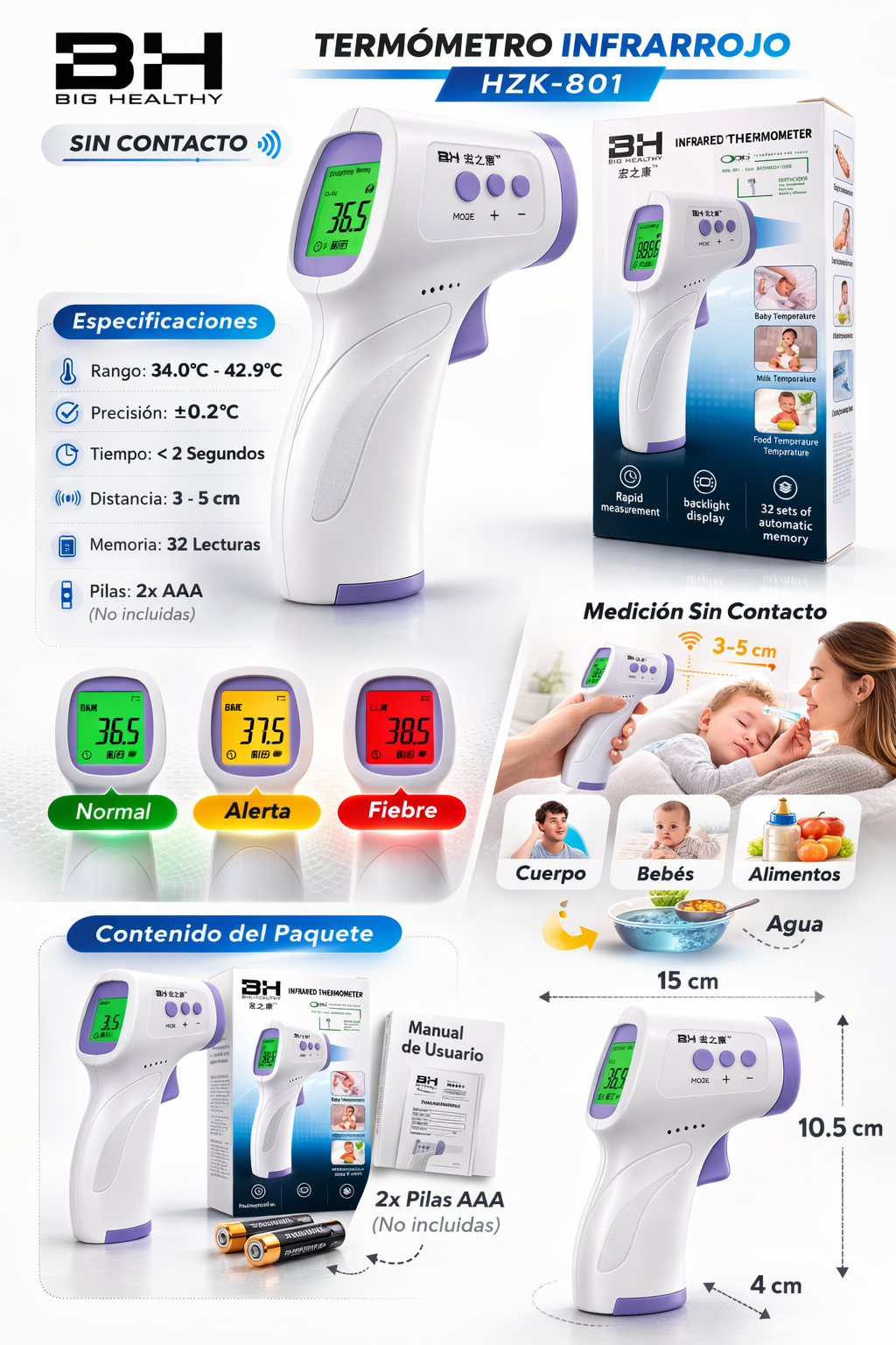 Controla la temperatura de forma rápida, segura y sin contacto con el termómetro infrarrojo HZK-801. Ideal para uso doméstico, bebés, alimentos o líquidos, este dispositivo ofrece resultados fiables en segundos.